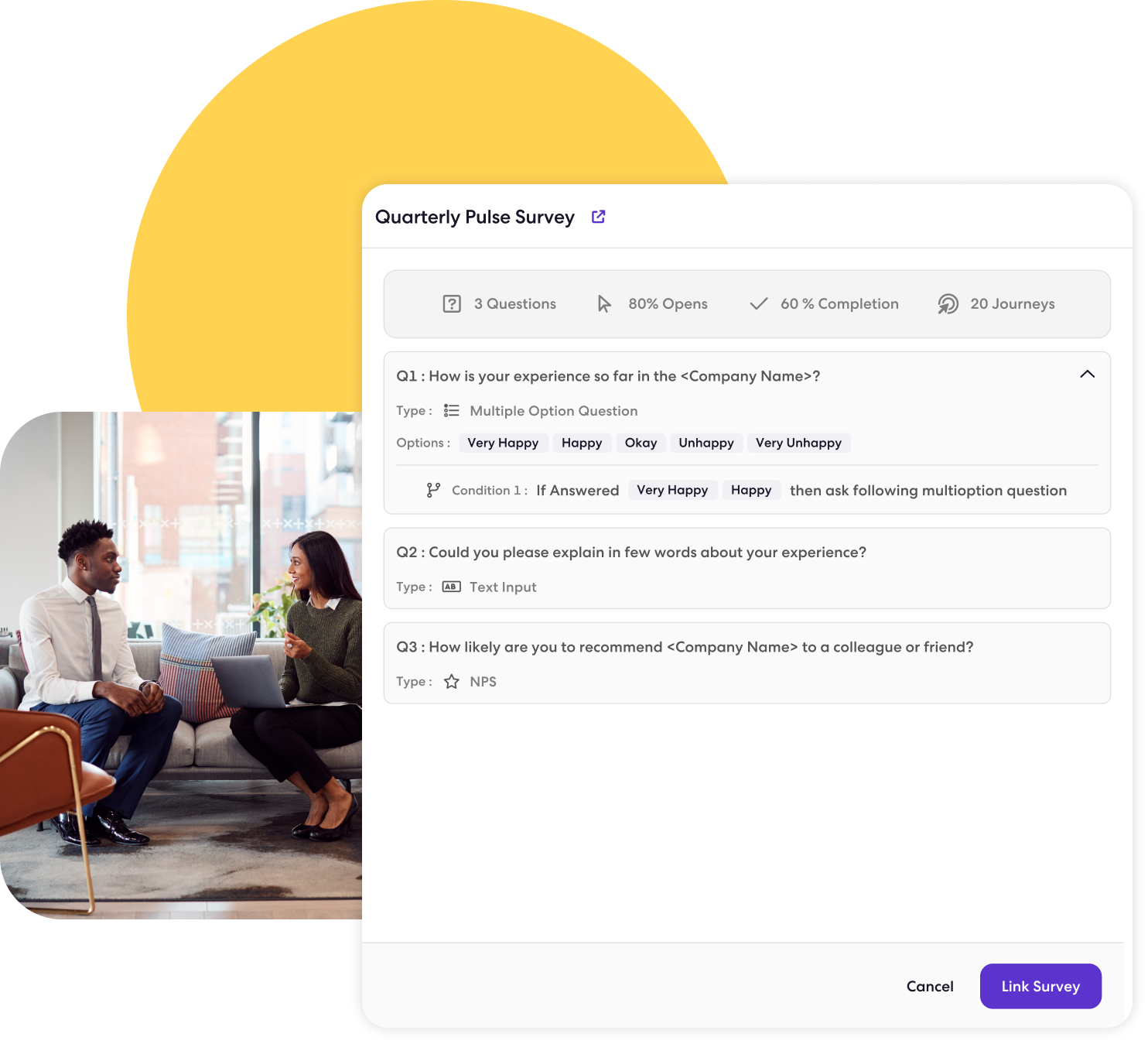 With the addition of Action Based Targeting (ABT), leverage Sense to automatically target and reach out to all NPS detractors to get ahead of problems. Or, send especially-high respondents links to leave online reviews on sites like Glassdoor and Google.