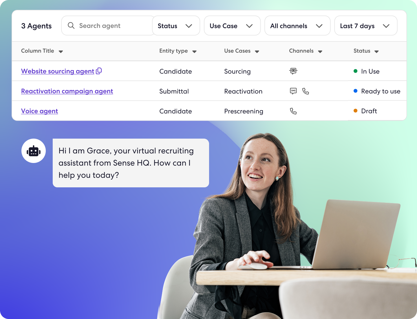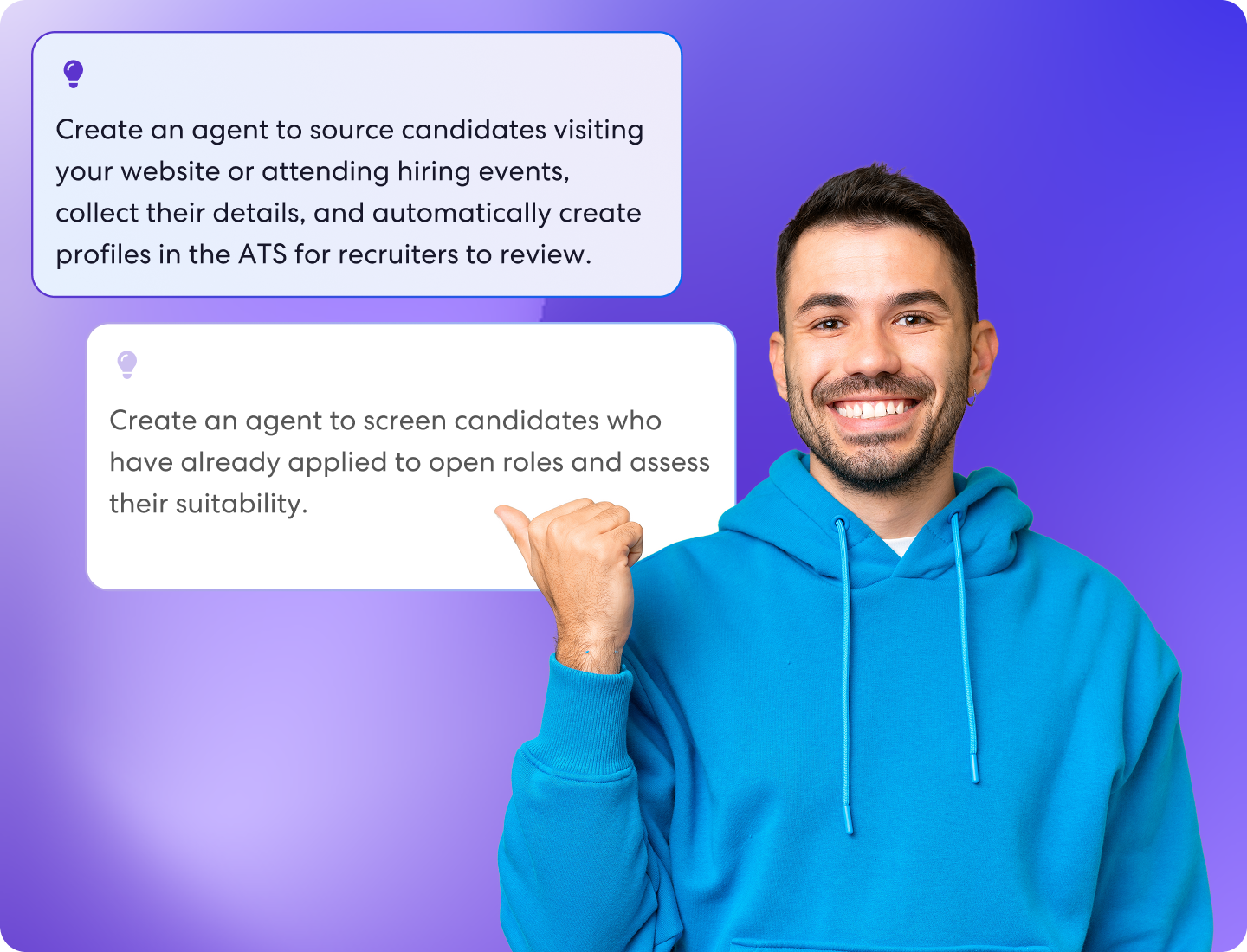 Convert more inbound interest into qualified candidates by deploying agents that engage visitors on your site, at events, or through campaigns. Agents capture key details, qualify candidates in real time, and move them directly into your hiring workflows.