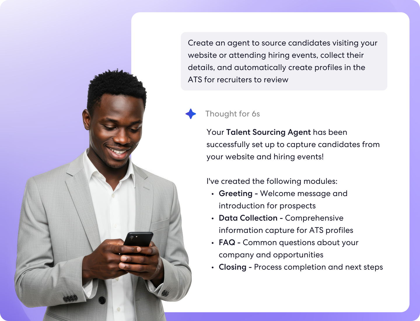 Agent Builder gives you full control to create AI agents that align with your recruiting processes and team priorities by configuring how they engage candidates, what tasks they handle, and how they connect with your systems. For example, you can build a high volume screening agent that automatically texts every applicant, asks role specific questions, and moves qualified candidates directly to scheduling so your team can focus on the right talent faster.