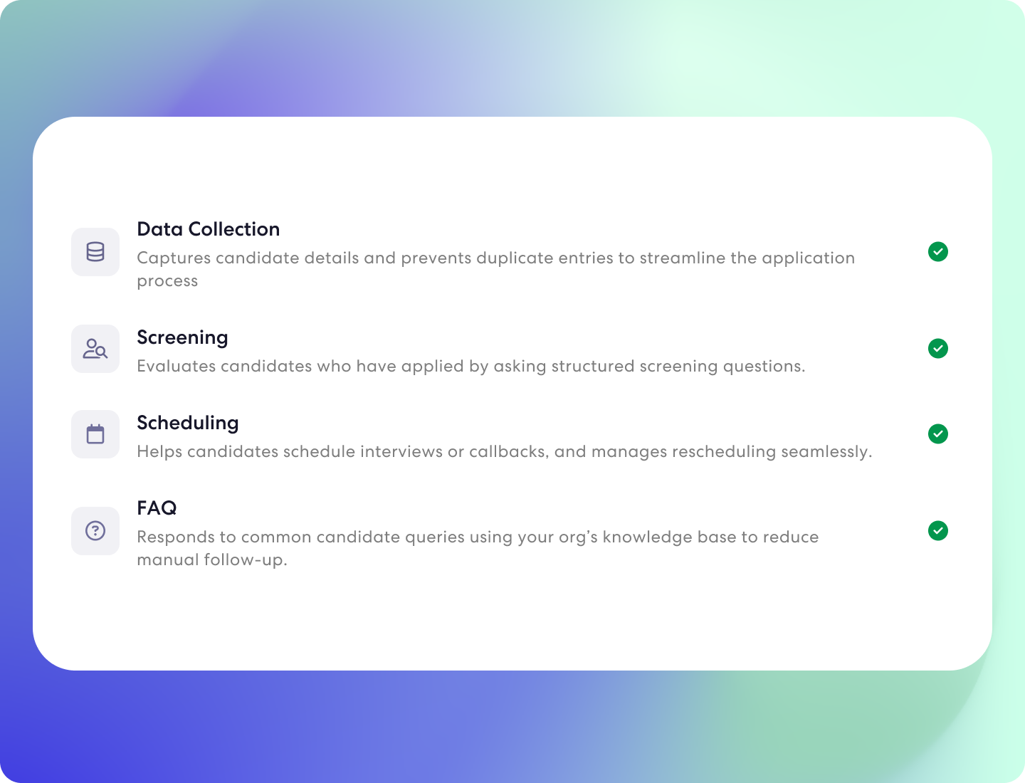 Create agents that engage every candidate consistently, regardless of volume. These agents can manage large volumes of conversations simultaneously, ensuring timely responses and a seamless experience at every touchpoint. This helps your team maintain high engagement while scaling efficiently without increasing workload.